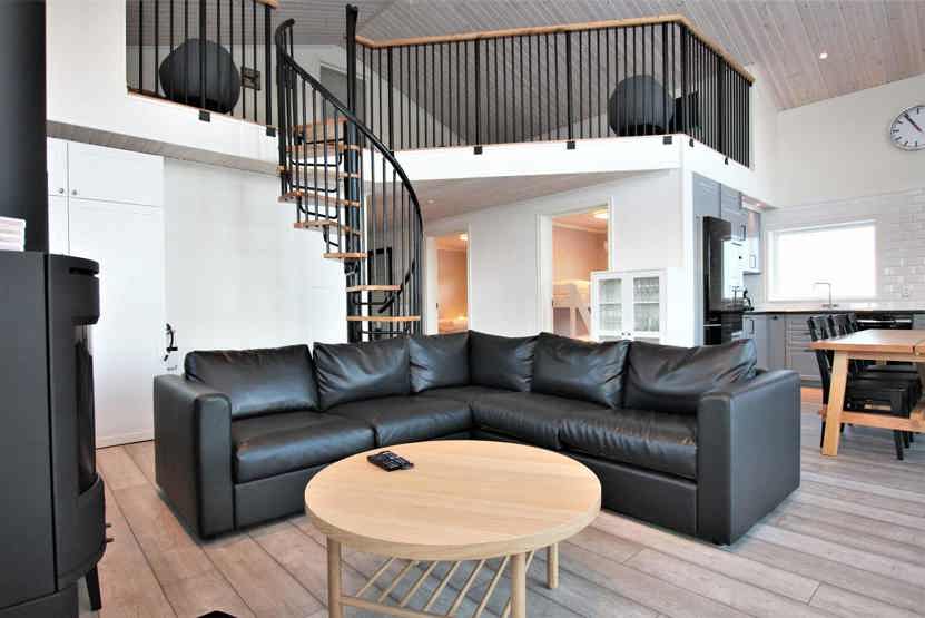 Stue med lille køkkenafdeling, TV, brændeovn (brænde indgår ikke).