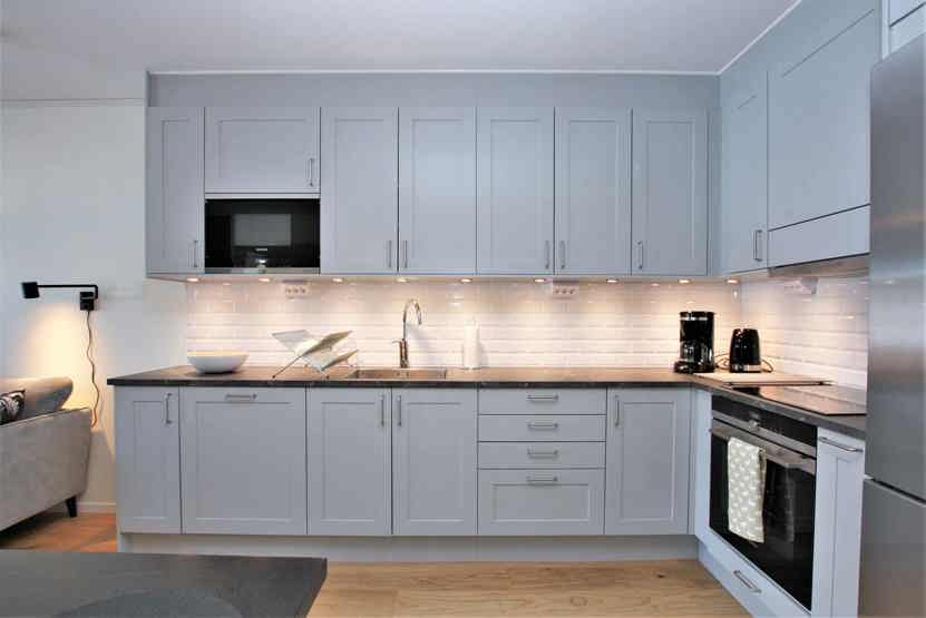 Køkkenet indeholder komfur med ovn, køleskab med fryser, opvaskemaskine, mikro.