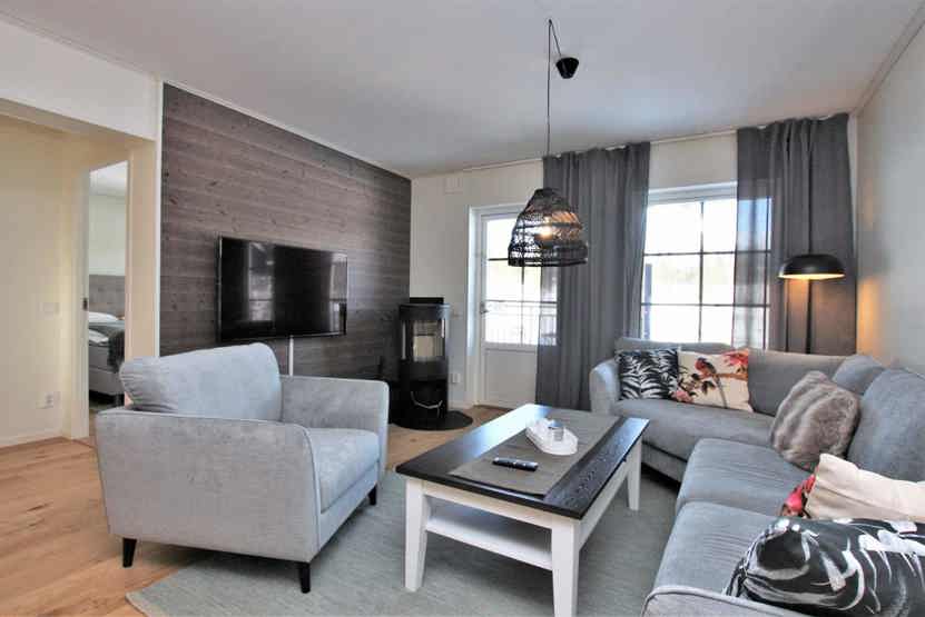 Stue med lille køkkenafdeling, TV, brændeovn (brænde indgår ikke).