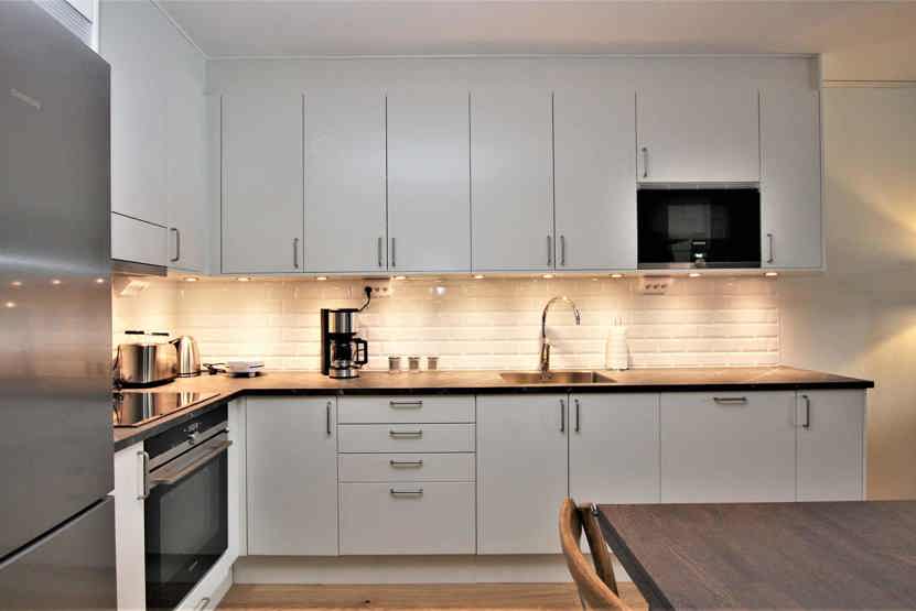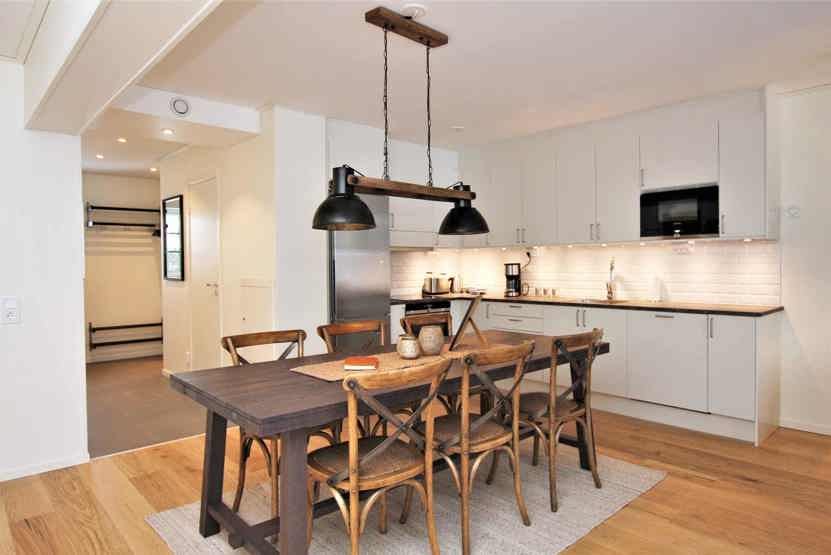 Køkkenet indeholder komfur med ovn, køleskab med fryser, opvaskemaskine, mikro.