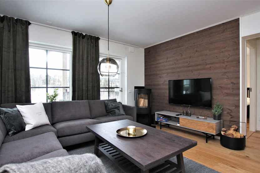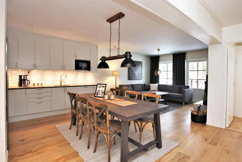 Stue med lille køkkenafdeling, TV, brændeovn (brænde indgår ikke).