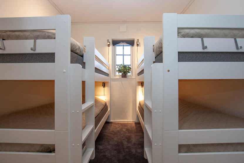 Soveværelse-1 = 1 dobbeltseng. Soveværelse-2 = 2 køjesenge hvor både over og underkøje er 90 cm bred. Soveværelse-3 = 1 køjeseng med 120 cm bred underkøje.
