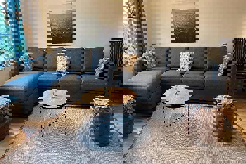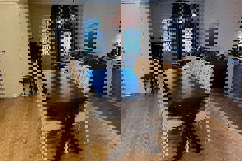 Stue med lille køkkenafdeling, TV, brændeovn (brænde indgår ikke).