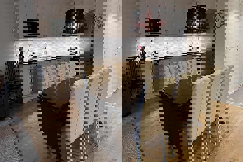 Køkkenet indeholder komfur med ovn, køleskab med fryser, opvaskemaskine, mikro.