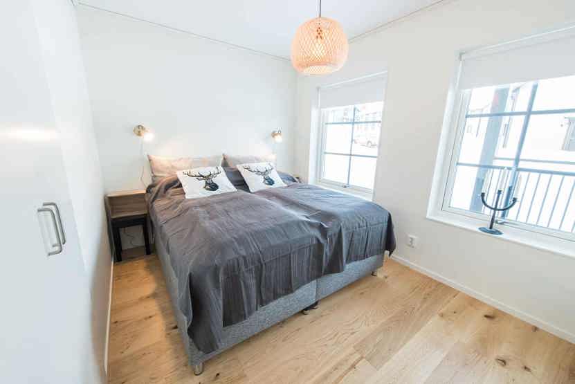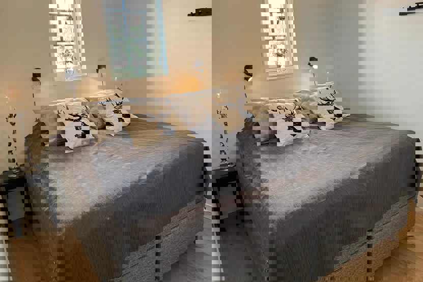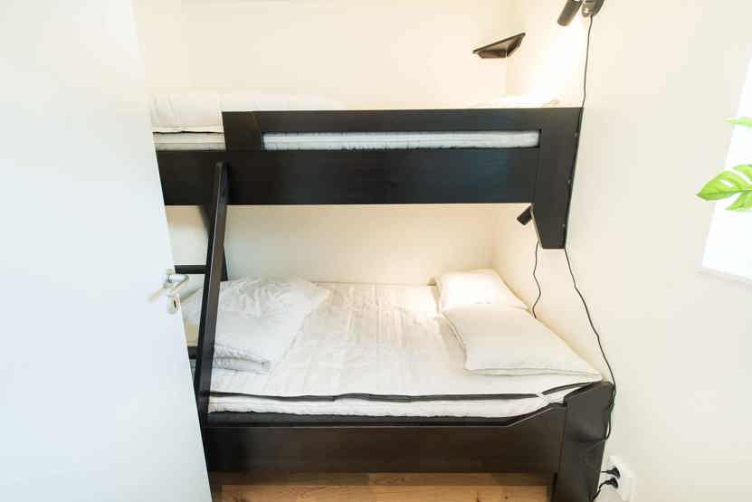 Soveværelse-1 = 1 dobbeltseng. Soveværelse-2 = 1 dobbeltseng som kan laves om til to enkeltsenge. Soveværelse-3 = 1 køjeseng med 120 cm bred underkøje.