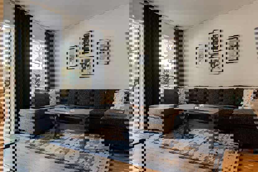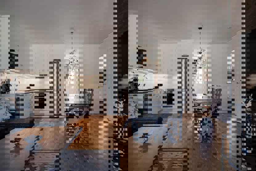 Stue med lille køkkenafdeling, TV, brændeovn (brænde indgår ikke).