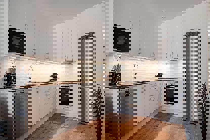 Køkkenet indeholder elkomfur med ovn, køleskab med fryser, opvaskemaskine, mikro.