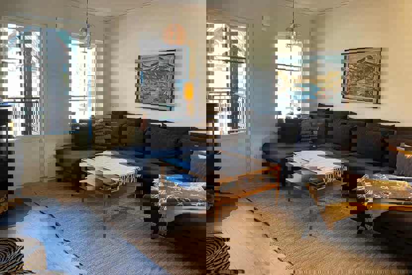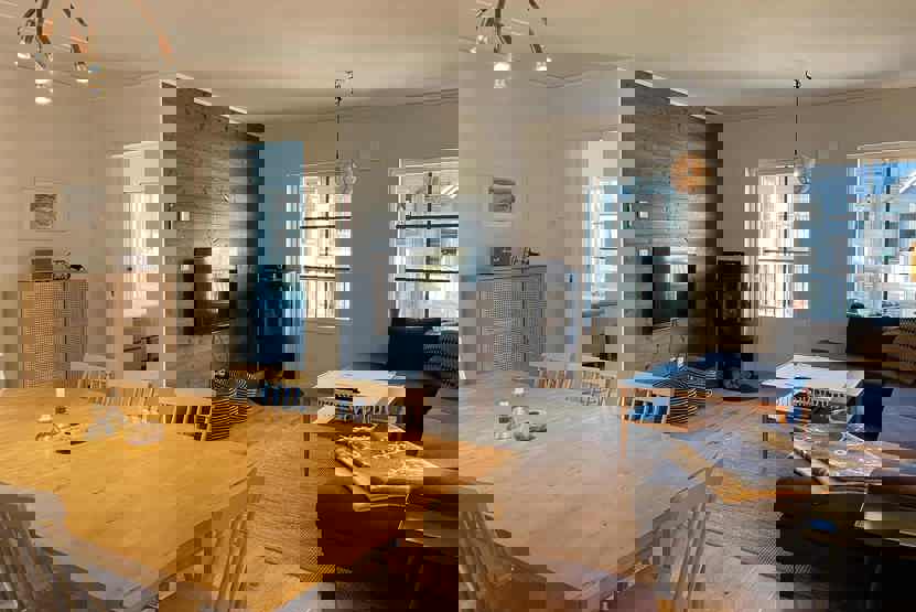 Stue med lille køkkenafdeling, TV, brændeovn (brænde indgår ikke).