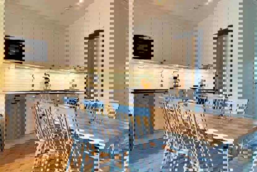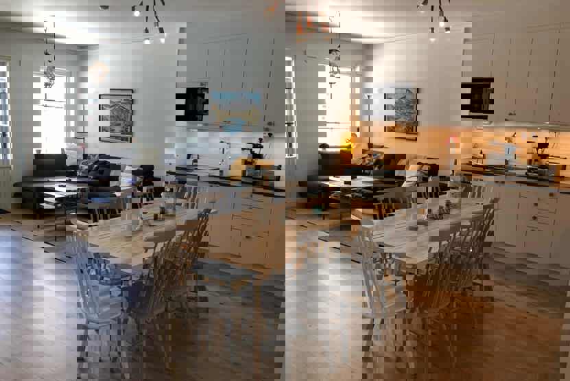 Køkkenet indeholder induktionskomfur, ovn, køleskab med fryser, opvaskemaskine, mikro.