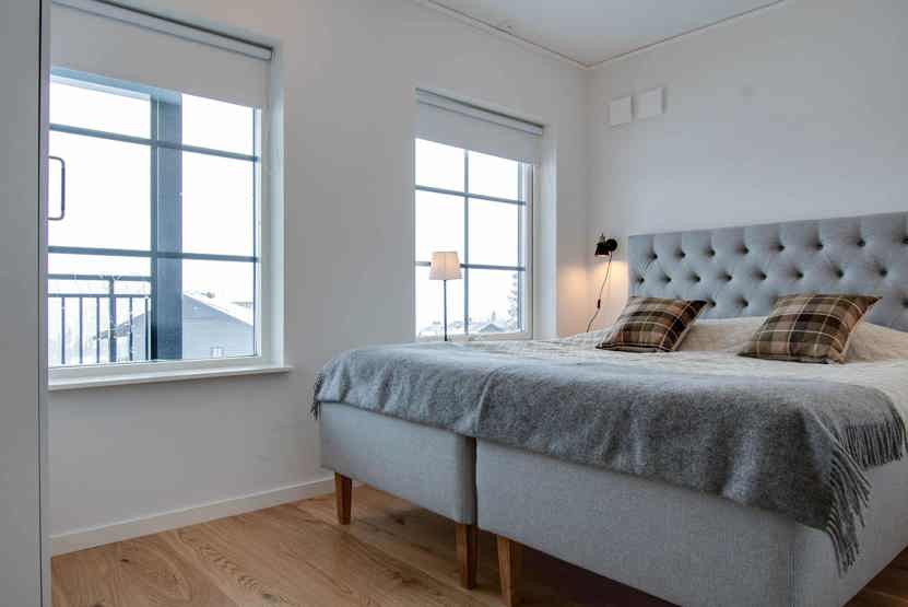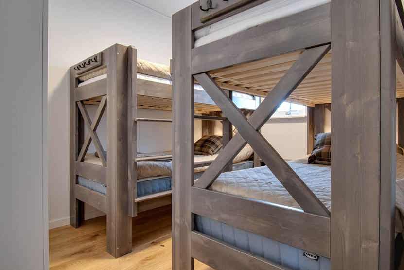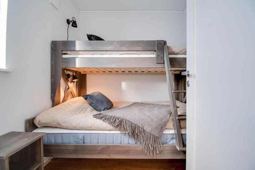 Soveværelse-1 = 1 dobbeltseng. Soveværelse-2 = 1 køjeseng med 120 cm bred underkøje. Soveværelse-3 = 2 køjesenge hvor både over og underkøje er 90 cm bred.