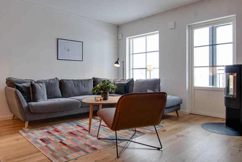 Stue med lille køkkenafdeling, TV, brændeovn (brænde indgår ikke).