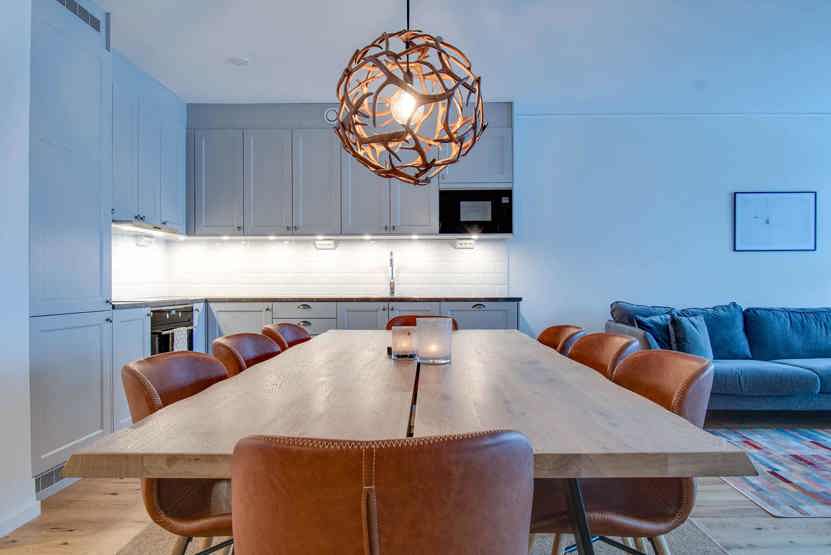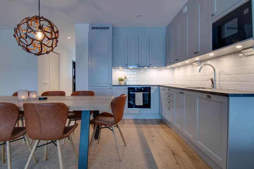Køkkenet indeholder komfur med ovn, køleskab med fryser, opvaskemaskine, mikro.