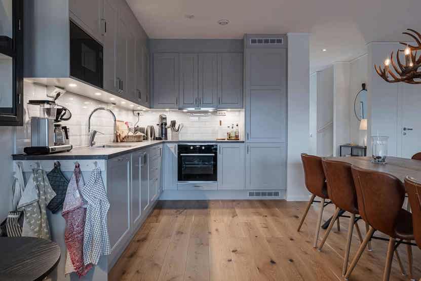 Køkkenet indeholder komfur med ovn, køleskab med fryser, opvaskemaskine, mikro.