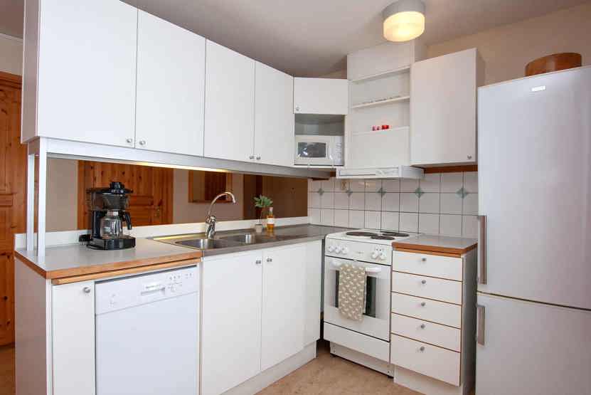 Køkkenet indeholder komfur med ovn, mikro, køleskab med fryser, opvaskemaskine.