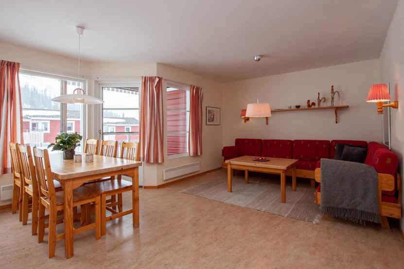 Stue med TV, lille køkkenafdeling. tørreskab, balkon/altan (der skovles ikke sne), skiopbevaring, 1parkering med motorvarmeplads.