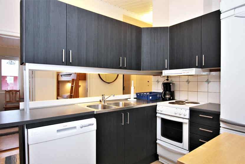 Køkkenet indeholder komfur med ovn, mikro, køleskab med fryser, opvaskemaskine.