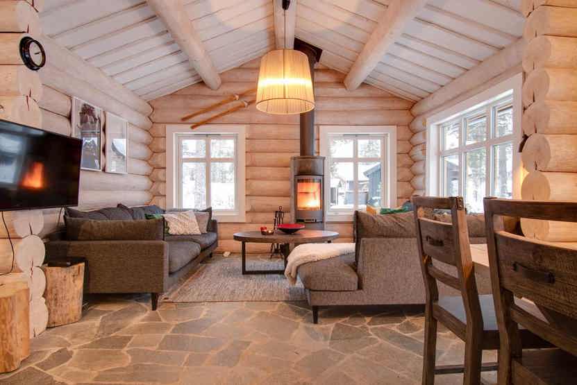 Stue med lille køkkenafdeling, TV, brændeovn (brænde indgår ikke).