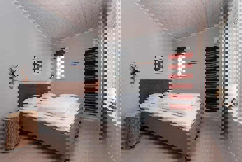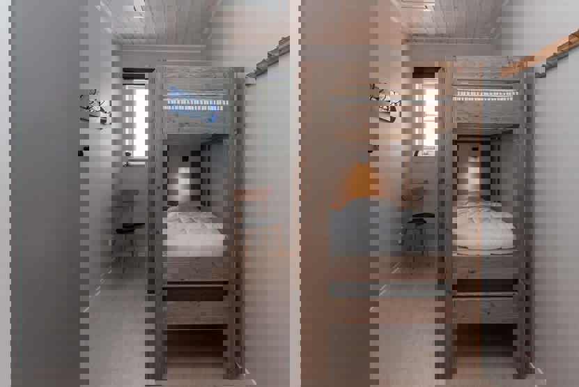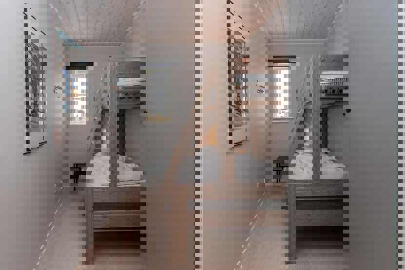 Soveværelse-1 = 1 dobbeltseng 180 cm bred. Soveværelse-2 = 1 køjeseng hvor både over og underkøje er 90 cm bred. Soveværelse-3 = 1 køyeseng med 120 cm bred underkøye og 80 cm bred overkøye.