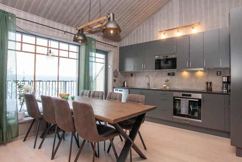 Køkkenet indeholder ovn, mikro, køleskab med fryser, komfur, opvaskemaskine.