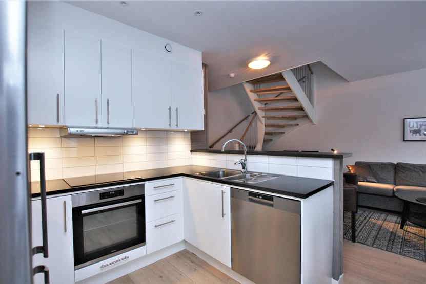 Køkkenet indeholder ovn, mikro, køleskab, komfur, fryser, opvaskemaskine.