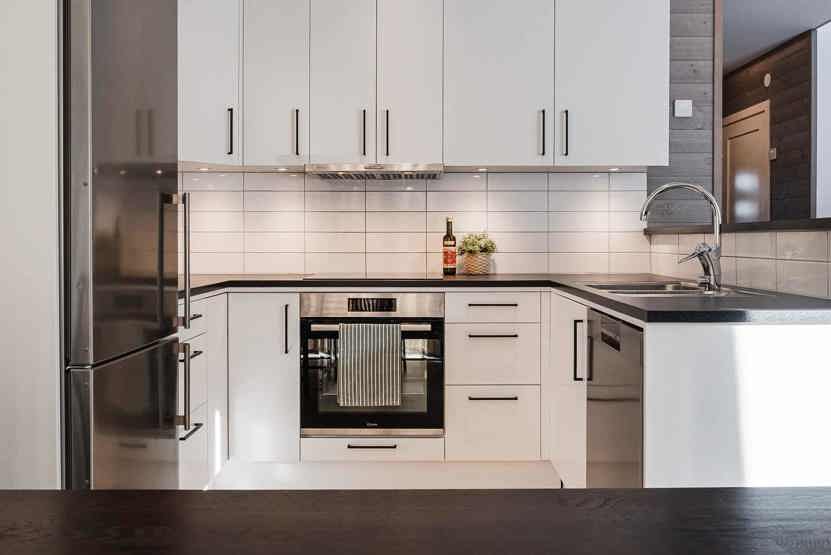 Køkkenet indeholder komfur, ovn, køleskab, fryser, opvaskemaskine, mikro.