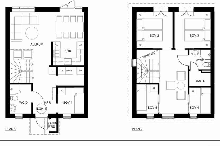 Badeværelse 1 = bruser/WC/sauna. Badeværelse 2 = bruser/WC.