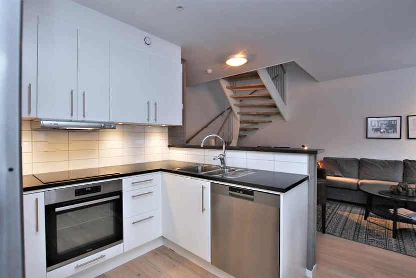 Køkkenet indeholder komfur, ovn, køleskab, fryser, opvaskemaskine, mikro.