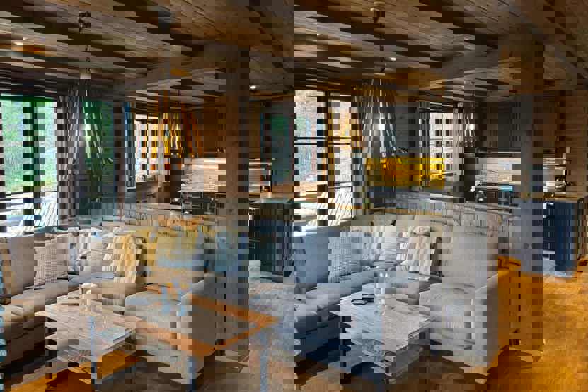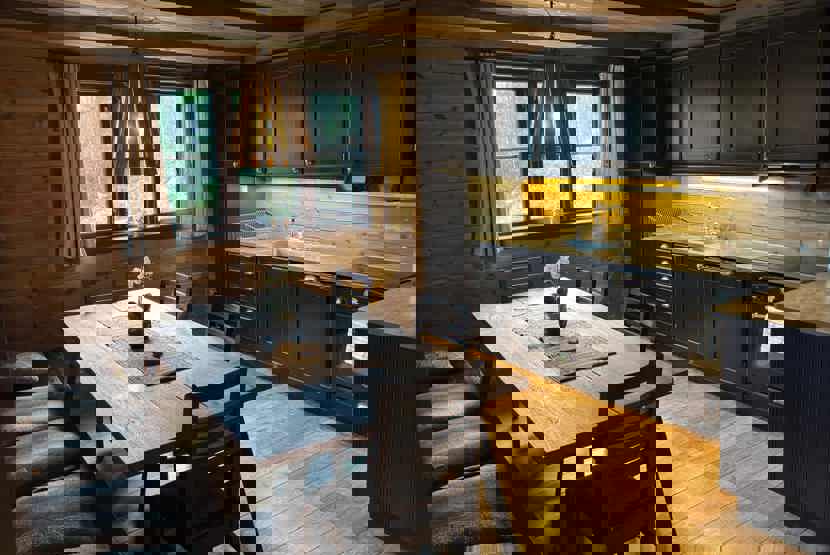 Stue med lille køkkenafdeling, TV, åben pejs (brænde indgår ikke).