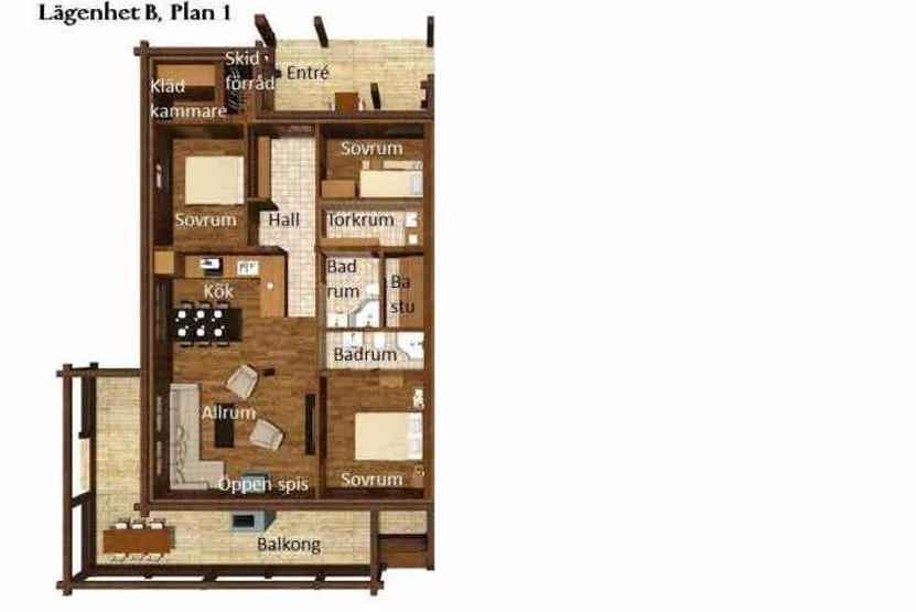Soveværelse-1 = 1 køjeseng med 160 cm bred underkøje. Soveværelse-2 = 1 køjeseng med 160 cm bred underkøje. Soveværelse-3 = 1 dobbeltseng, indgangen til badeværelse 2.