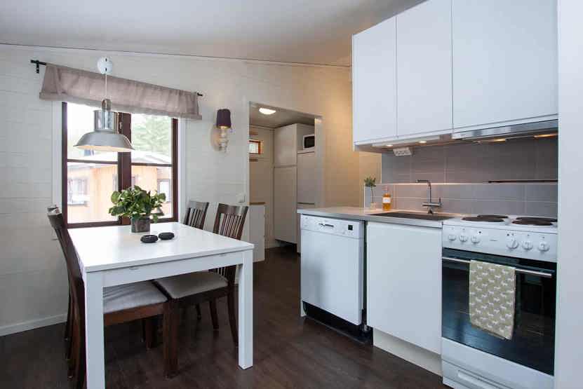 Køkkenet indeholder komfur med ovn, mikro, køleskab med fryser, opvaskemaskine.