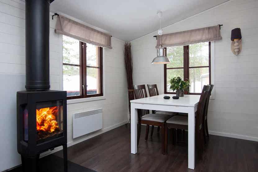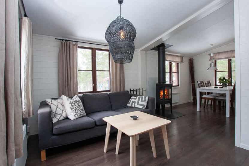 Stue med TV, lille køkkenafdeling, brændeovn (brænde indgår ikke).
