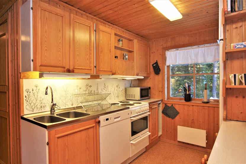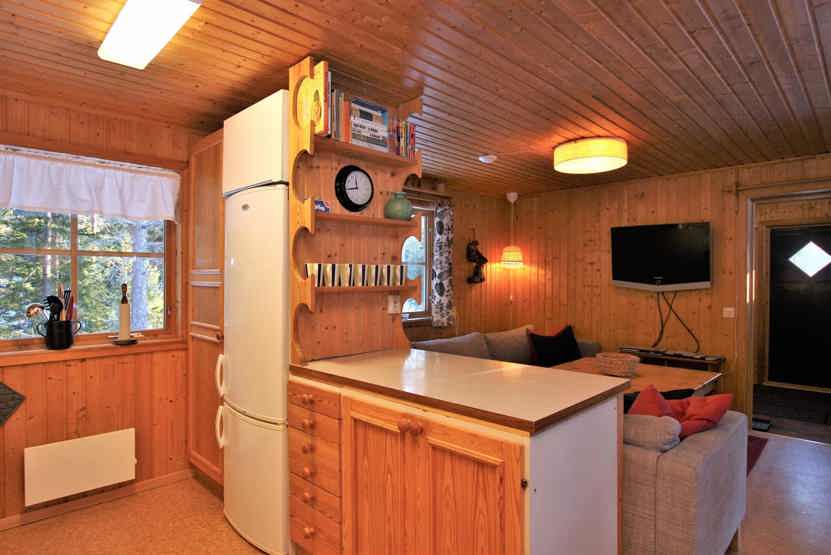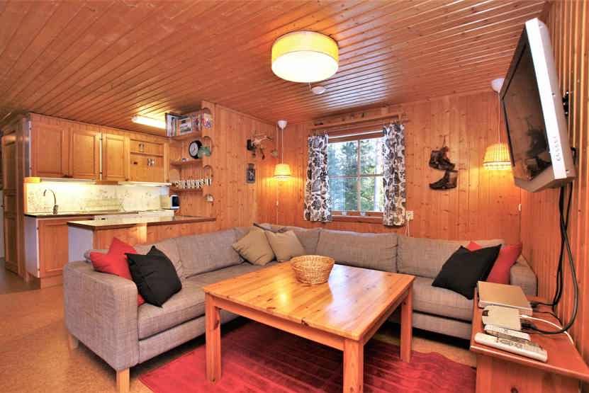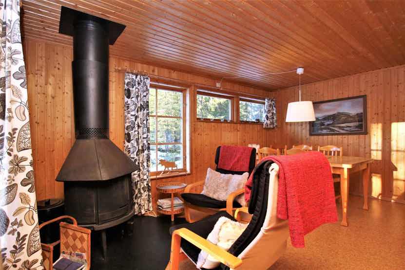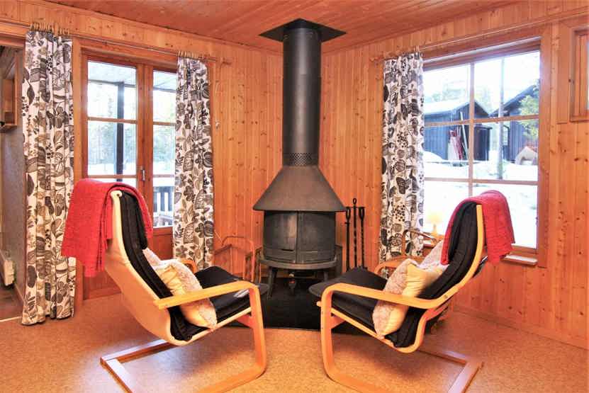 Stue med lille køkkenafdeling, TV, brændeovn (brænde indgår ikke).