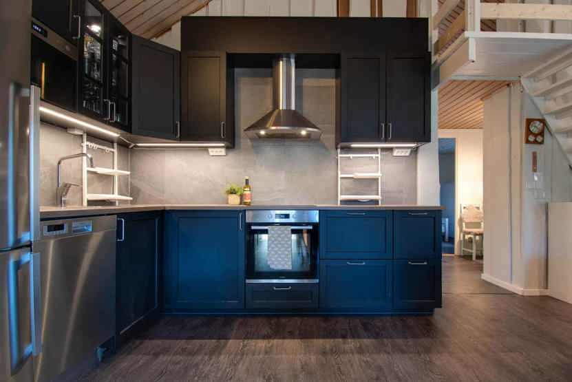 Køkkenet indeholder komfur med ovn, køleskab med fryser, opvaskemaskine, mikro.
