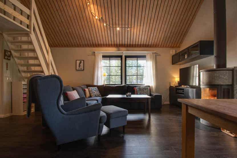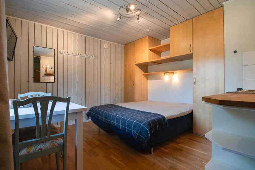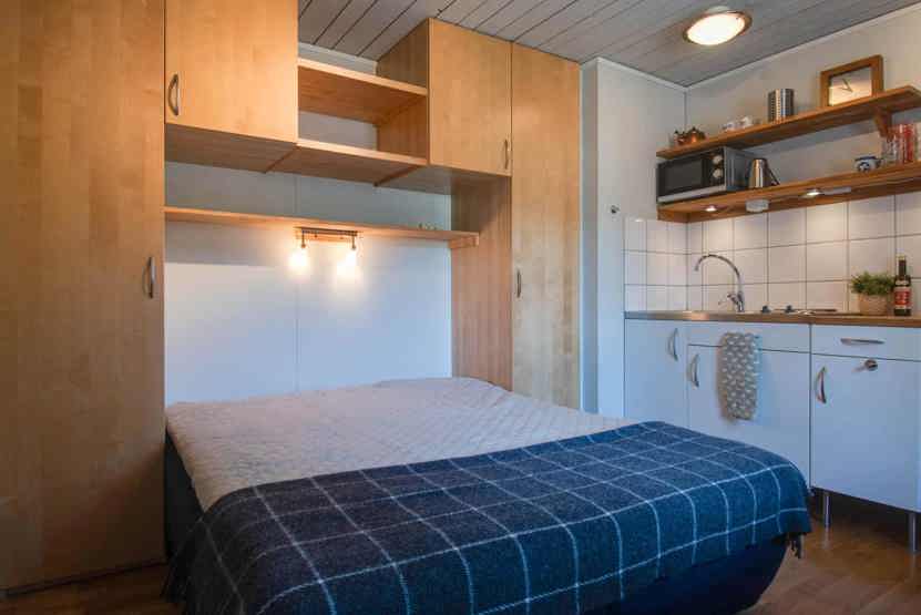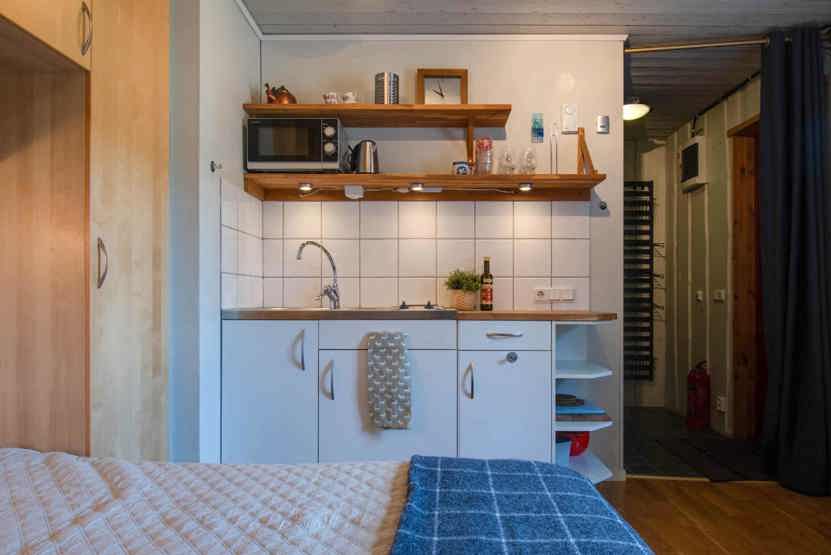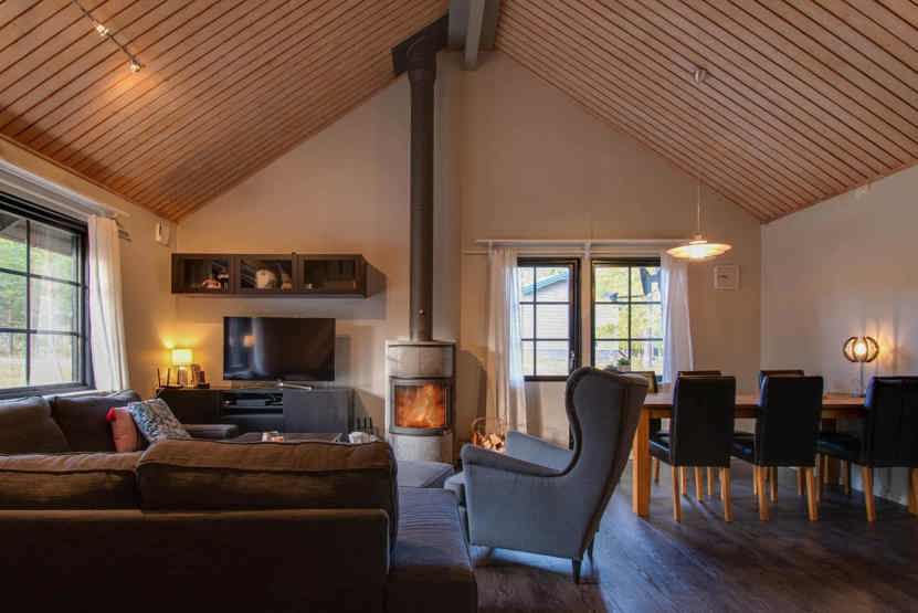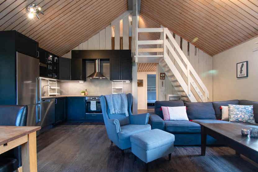 Stue med lille køkkenafdeling, TV, brændeovn (brænde indgår ikke).