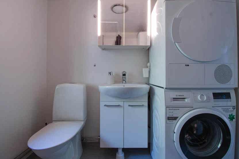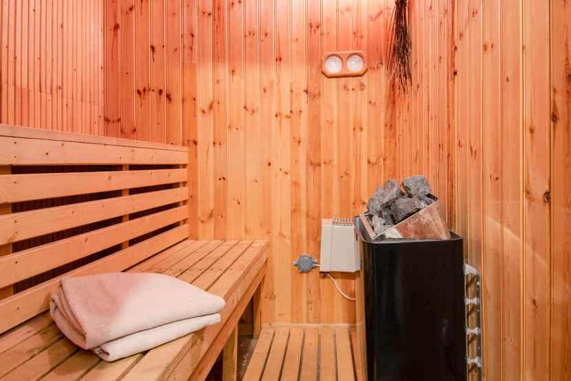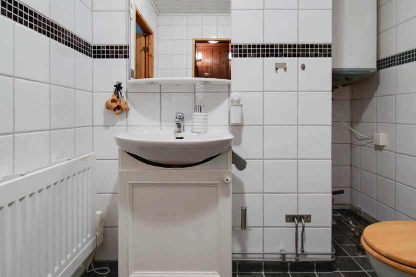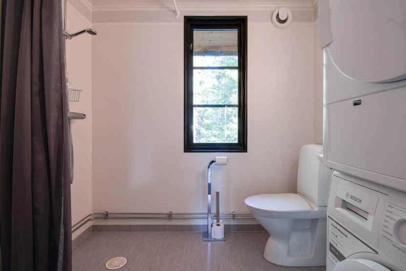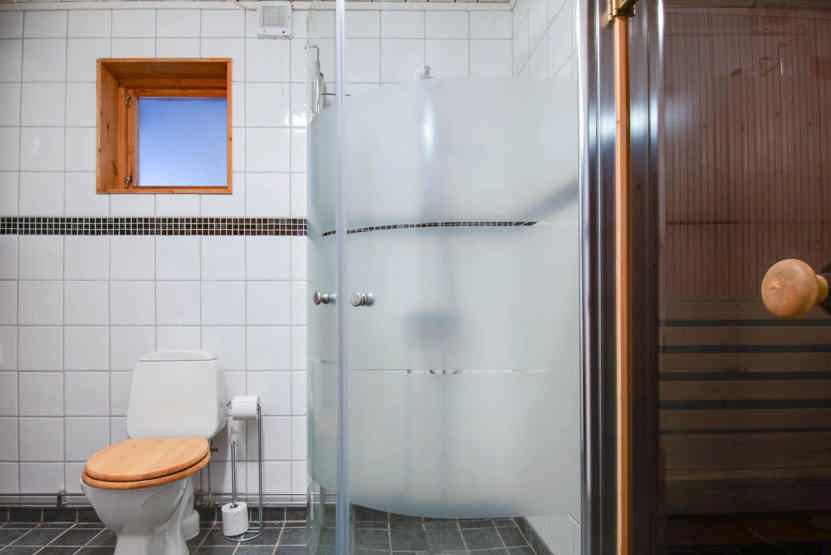 Badeværelse 1 = bruser/WC. Badeværelse 2 = bruser/WC/sauna, I gæstehuset, bruser/WC/sauna.