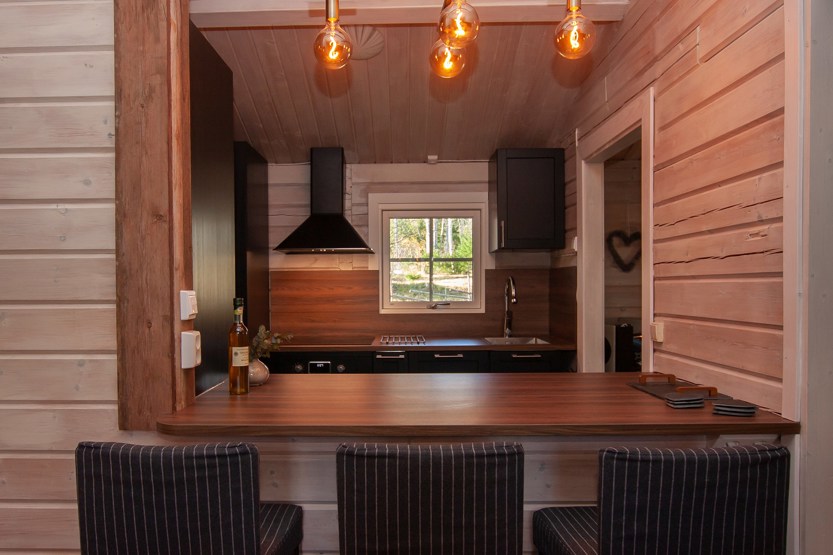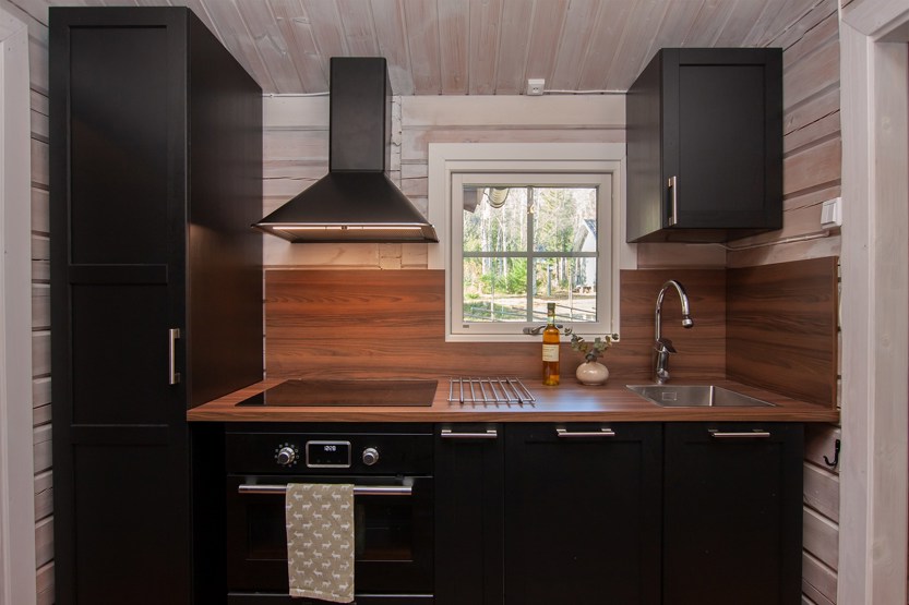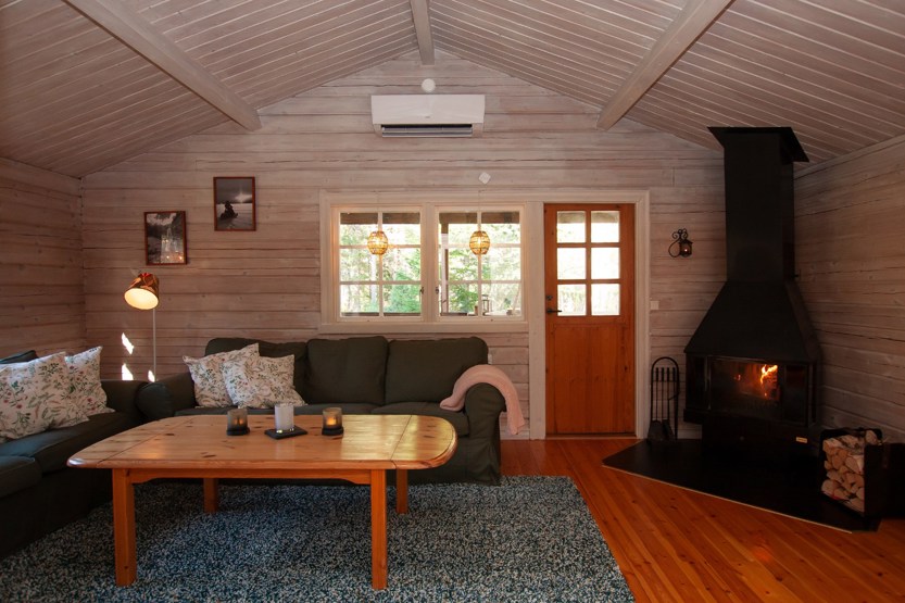 Stue med lille køkkenafdeling, TV, brændeovn (brænde indgår ikke).
