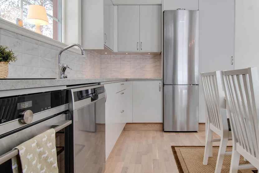 Køkkenet indeholder komfur med ovn, køleskab med fryser, opvaskemaskine, mikro.