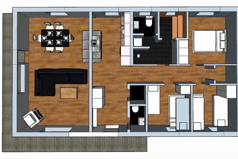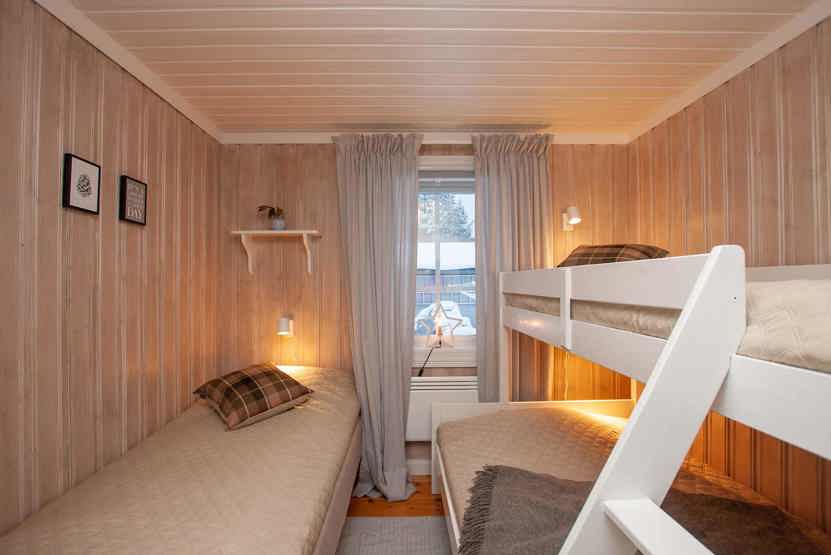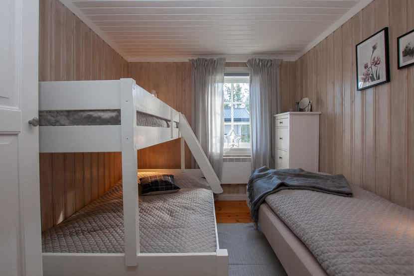 Soveværelse-1 = 1 dobbeltseng. Soveværelse-2 = 1 køyeseng med 120 cm bred underkøye og 80 cm bred overkøye, 1 enkeltseng. Soveværelse-3 = 1 køyeseng med 120 cm bred underkøye og 80 cm bred overkøye, 1 enkeltseng.