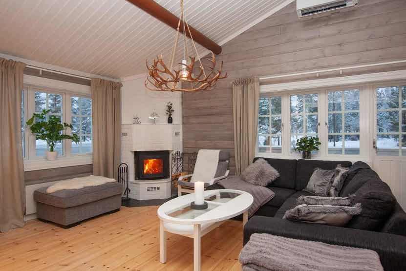 Stue med lille køkkenafdeling, TV, brændeovn (brænde indgår ikke).