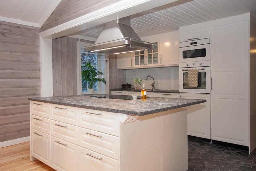 Køkkenet indeholder komfur, ovn, køleskab med fryser, opvaskemaskine, mikro.