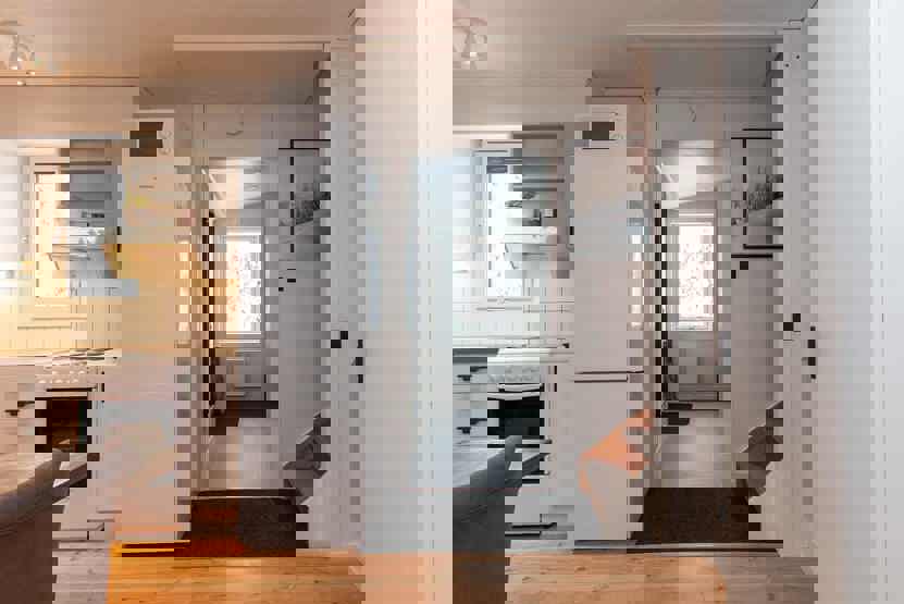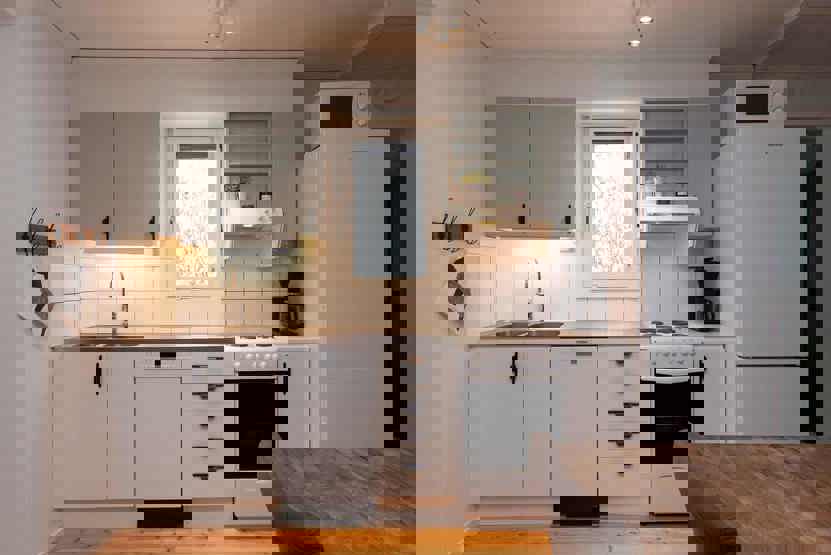Køkkenet indeholder komfur med ovn, mikro, køleskab med fryser, opvaskemaskine.
