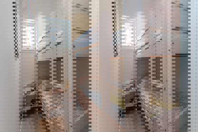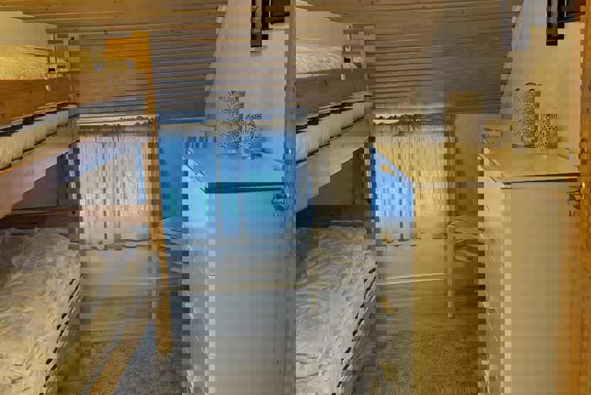 Soveværelse-1 = 1 dobbeltseng 160 cm bred. Soveværelse-2 = 1 køjeseng hvor både over og underkøje er 80 cm bred. Soveværelse-3 = 1 køjeseng hvor både over og underkøje er 80 cm bred.