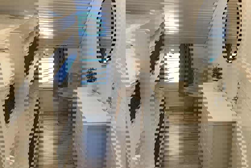 Soveværelse-1 = 1 dobbeltseng 160 cm bred. Soveværelse-2 = 1 køyeseng med 120 cm bred underkøye og 90 cm bred overkøye. Soveværelse-3 = 1 køjeseng hvor både over og underkøje er 90 cm bred.