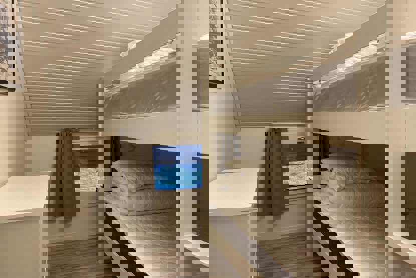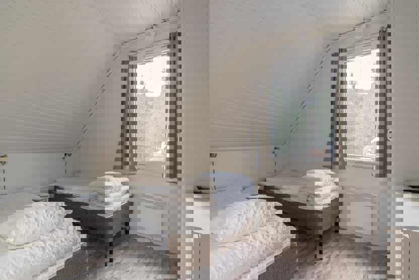 Soveværelse-1 = 1 dobbeltseng som kan laves om til to enkeltsenge. Soveværelse-2 = 1 køyeseng med 120 cm bred underkøye og 90 cm bred overkøye. Soveværelse-3 = 1 køjeseng hvor både over og underkøje er 90 cm bred.