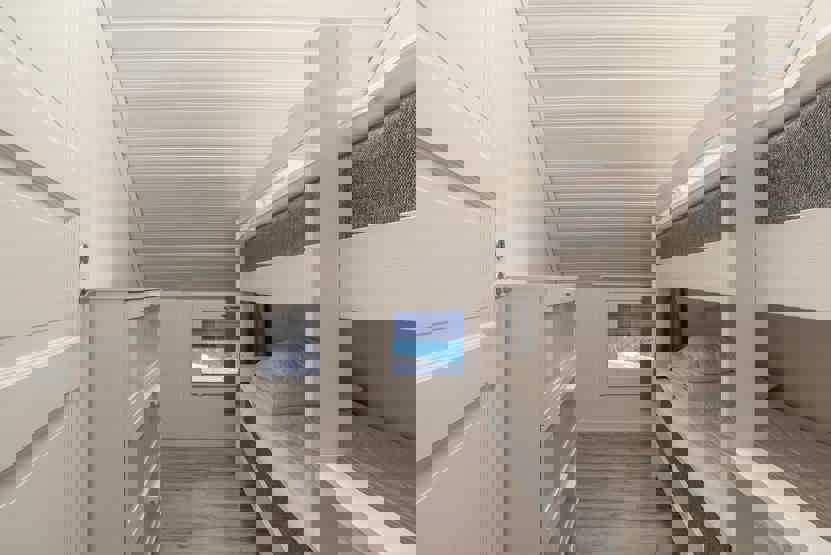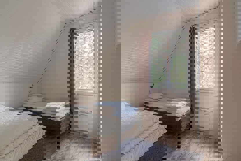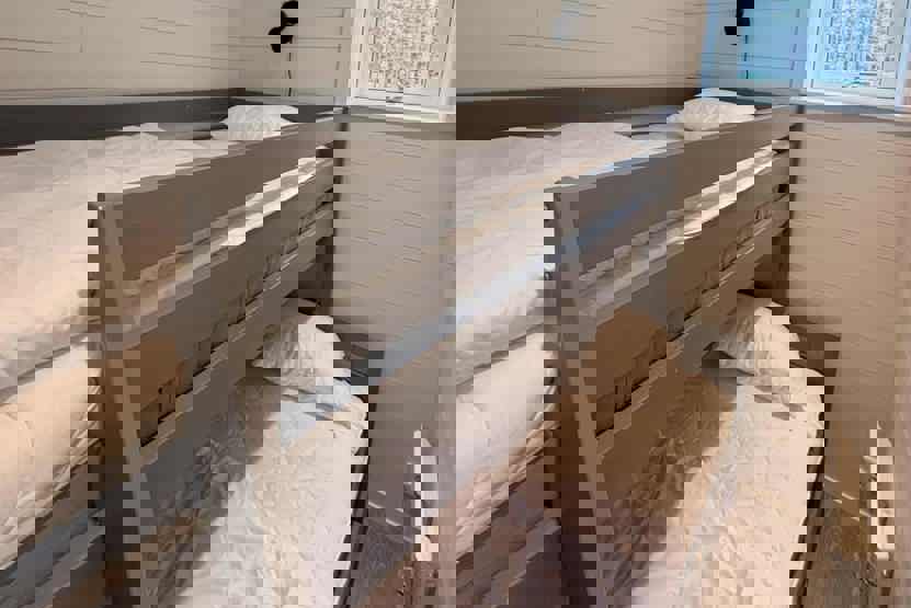 Soveværelse-1 = 1 dobbeltseng som kan laves om til to enkeltsenge. Soveværelse-2 = 1 køyeseng med 120 cm bred underkøye og 90 cm bred overkøye. Soveværelse-3 = 1 køjeseng hvor både over og underkøje er 90 cm bred.