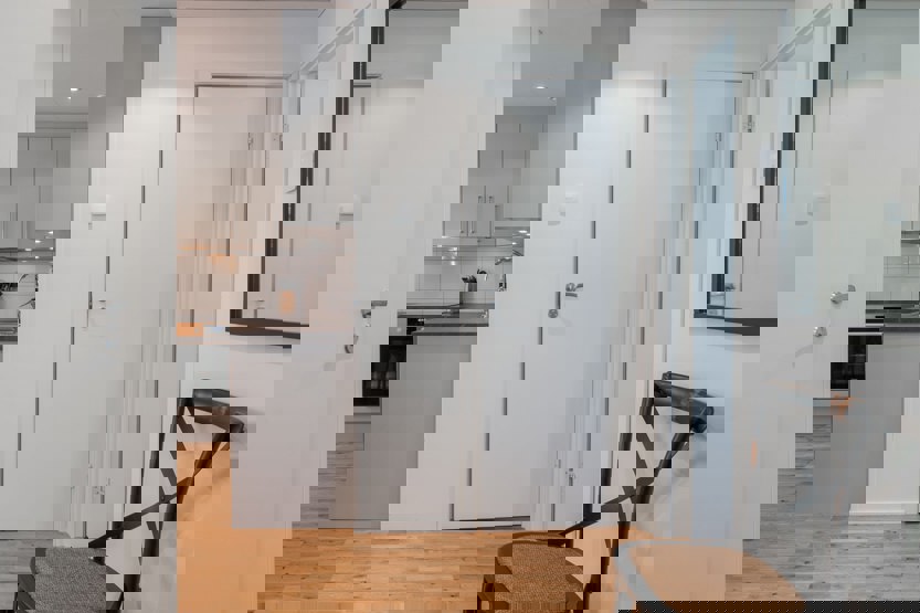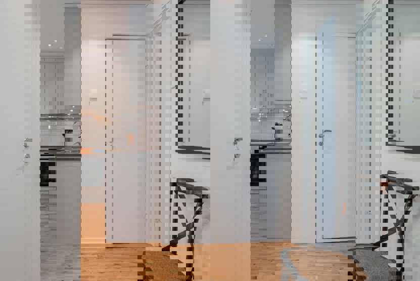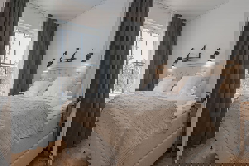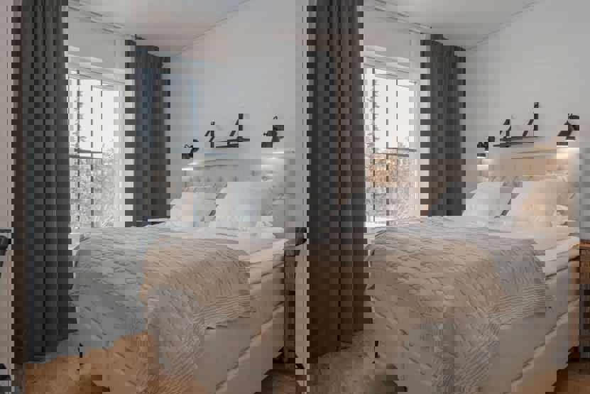 Soveværelse-1 = 1 dobbeltseng 160 cm bred. Soveværelse-2 = 1 køjeseng med 120 cm bred underkøje og 80 cm bred overkøje.