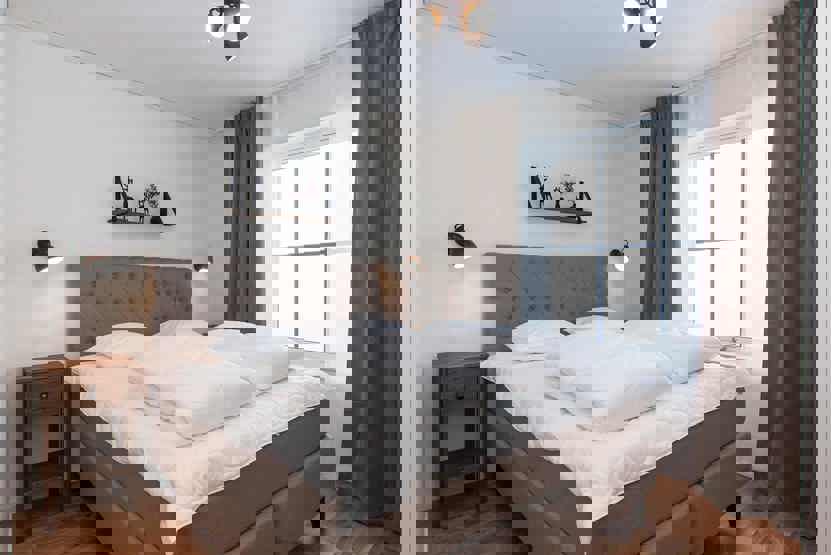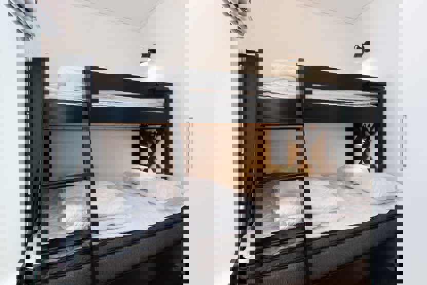 Soveværelse-1 = 1 dobbeltseng 160 cm bred. Soveværelse-2 = 1 køjeseng med 120 cm bred underkøje og 80 cm bred overkøje.