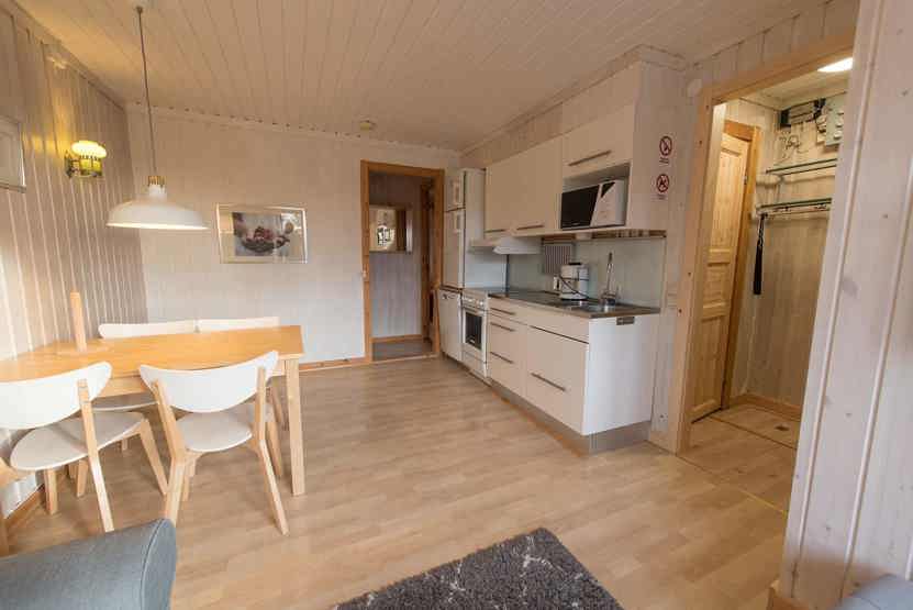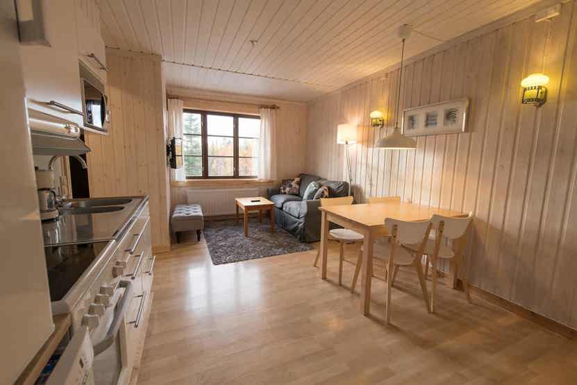 Stue med TV, lille køkkenafdeling. tørreskab, balkon/altan (der skovles ikke sne), skiopbevaring, 1 parkeringsplads.