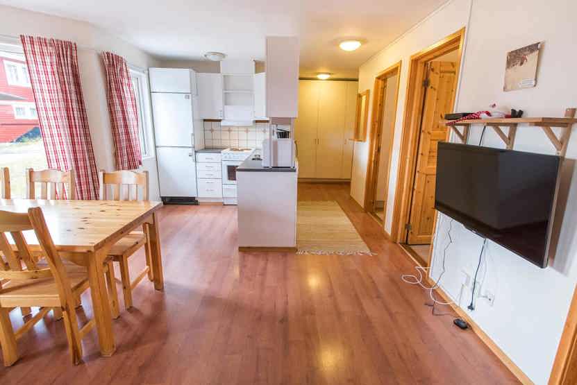Stue med TV, lille køkkenafdeling.