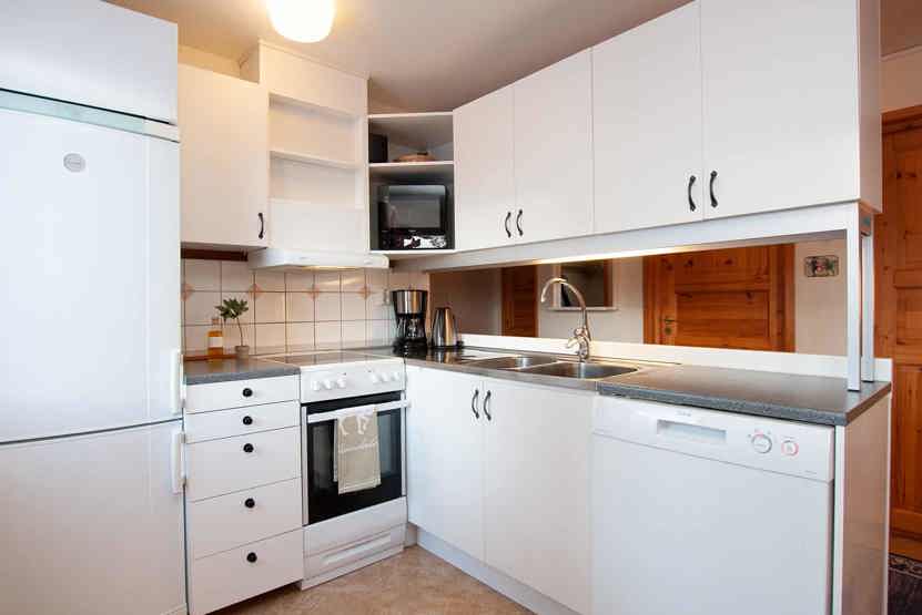 Køkkenet indeholder mikro, køleskab med fryser, opvaskemaskine, komfur med ovn.